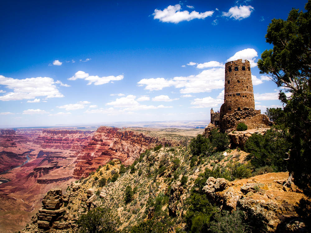 Great shot of the Grand Canyon with Colorado river and the Watchtower.The Watchtower is a great piece of architecture with artistic integration of Native American culture by Mary Colter.