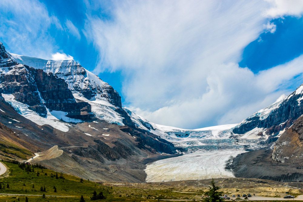 Hi everyone! Wow, sometimes life comes up and gives you a shove! All is well out here on the road, just been super busy for the last week and without wi-fi. I’ve missed this blog and all of you though and am glad to be back in touch. I haven’t stopped taking photos though and have been in some beautiful corners of the continent, so without further ado I will pick up right where I left off: this is the amazing Athabasca Glacier in the Columbia Icefields of Jasper National Park, Alberta. The clouds were pretty awesome that day. Check out the cars in the foreground for perspective.